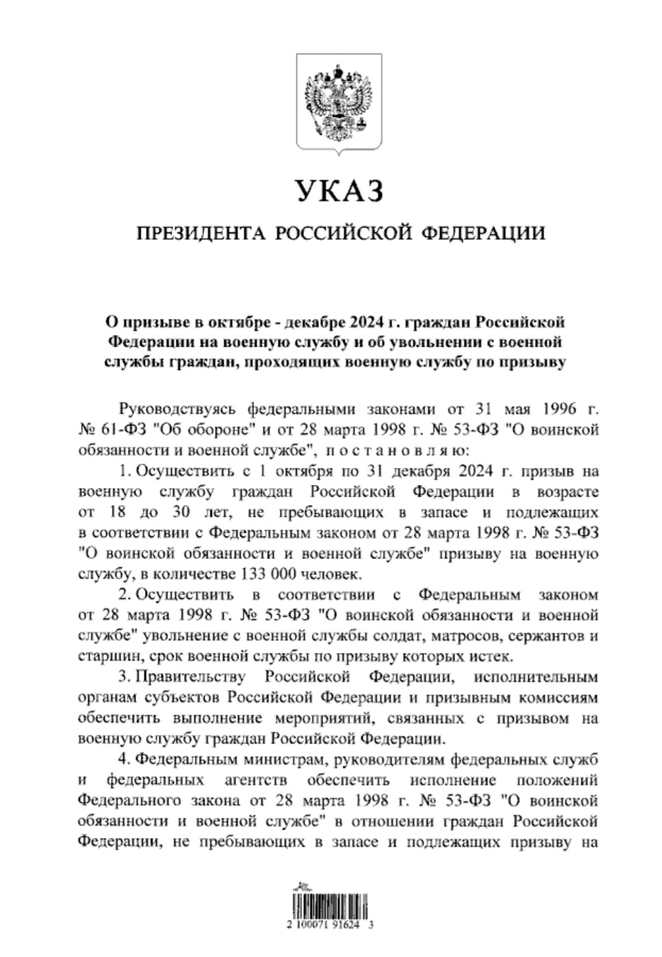 Указано, что российский диктатор отдал приказ призвать на службу 133 тысячи срочников в возрасте от 18 до 30 лет, которые не находятся в запасе и подлежат призыву.