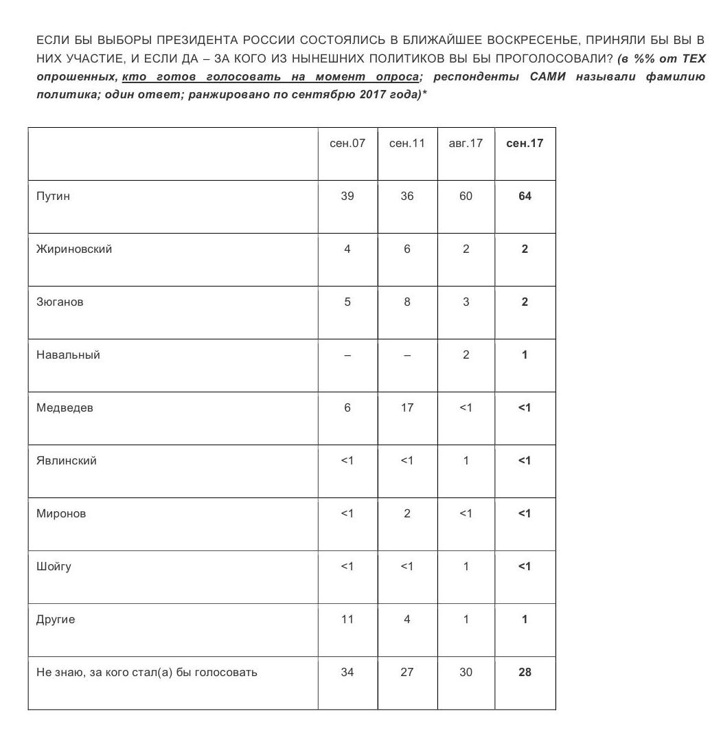 Рейтинг других кандидатов находится в пределах статистической погрешности: провокатор и шовинист Владимир Жириновский – 2%, советский коммунист Геннадий Зюганов – 2%, русский националист Алексей Навальный – 1%.