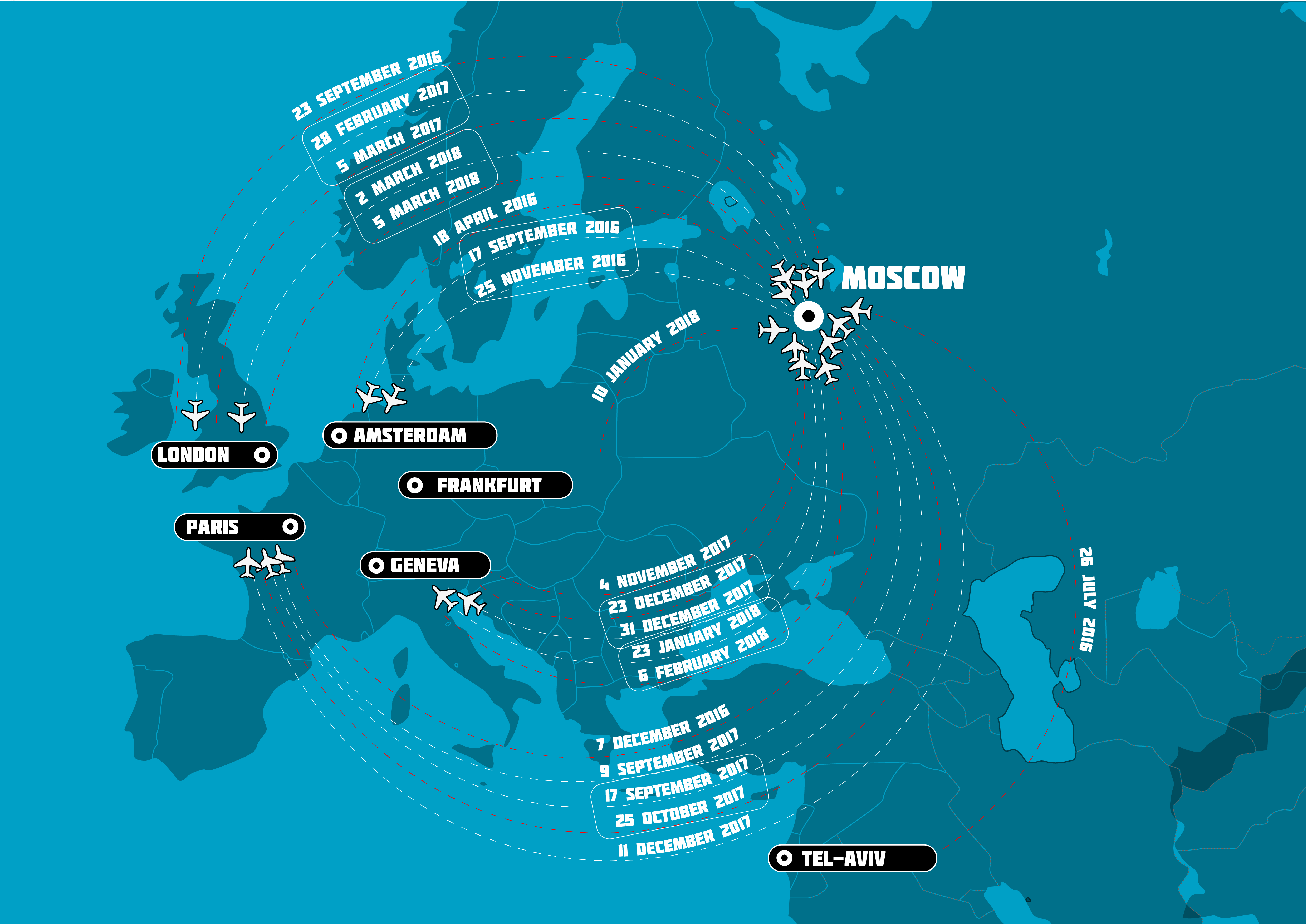 В период с сентября 2017 года по февраль 2018 года "Петров" совершил еще пять поездок во Францию и Швейцарию, обычно прилетая в Париж и возвращаясь из Женевы. Последняя поездка была самой продолжительной - он провел две недели в Европе, в период с 23 января по 6 февраля и летел в Женеву и обратно оттуда же.