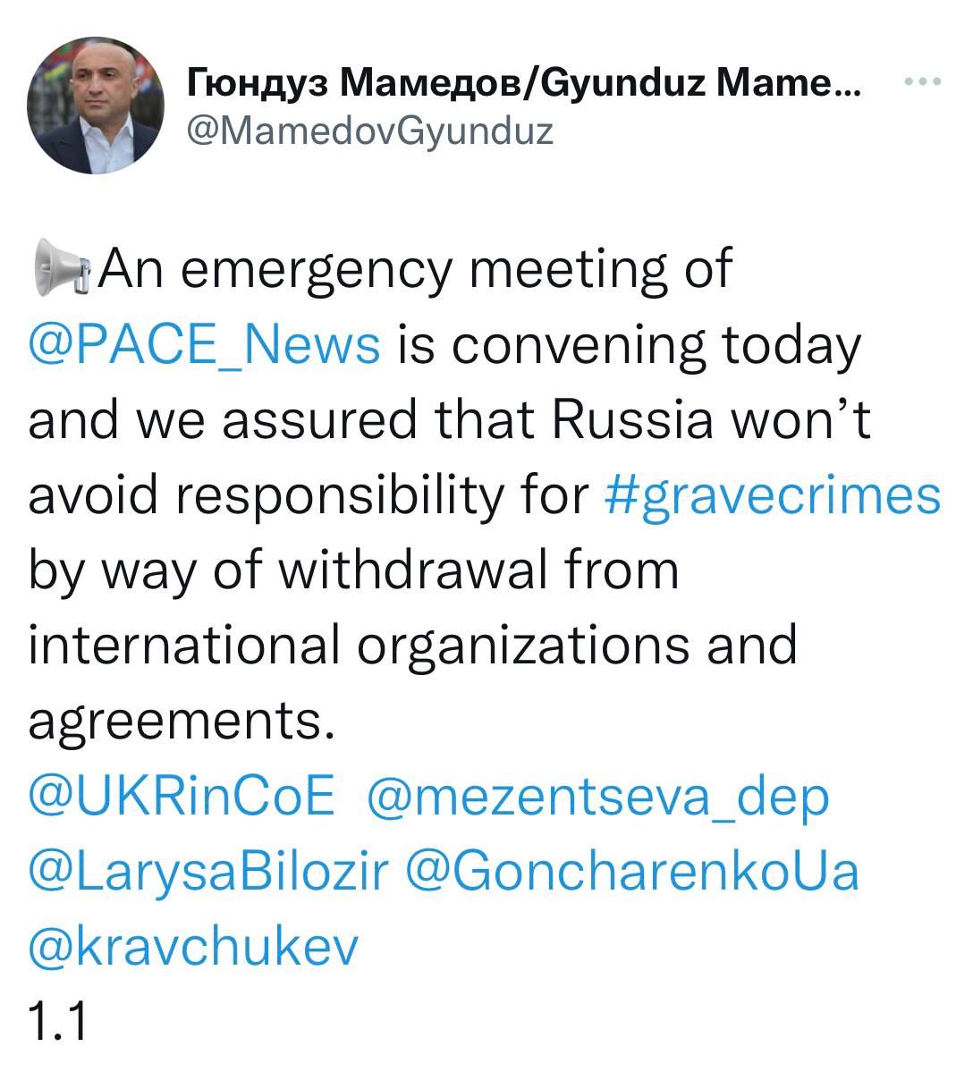 Сегодня Парламентская ассамблея Совета Европы (ПАСЕ) заверила, что Россия не уйдет от ответственности за тяжкие преступления путем выхода из международных организаций и соглашений. Об этом сообщил Гюндуз Мамедов, эксперт по международному уголовному праву, кандидат юридических наук, заместитель генерального прокурора Украины в 2019–2021 годах.