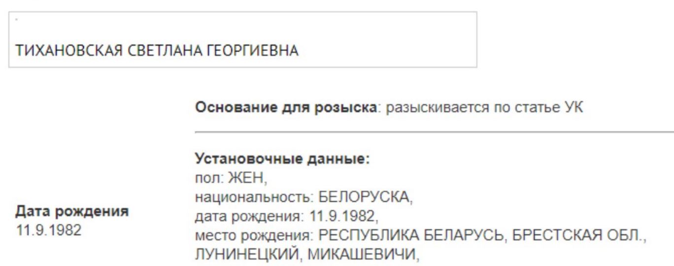 Министерство внутренних дел России объявило бывшую кандидатку в президенты Беларуси Светлану Тихановскую в розыск. Государственное агентство ТАСС со ссылкой на источник пишет, что Тихановскую объявили в розыск в Беларуси, но он также будет осуществляться и в России, так как "речь идет о межгосударственном розыске".
