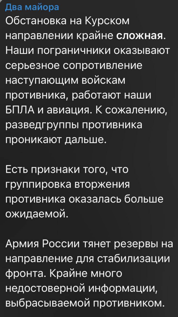 Панические настроения также присутствуют в пропагандистском Telegram-канале "Два майора".