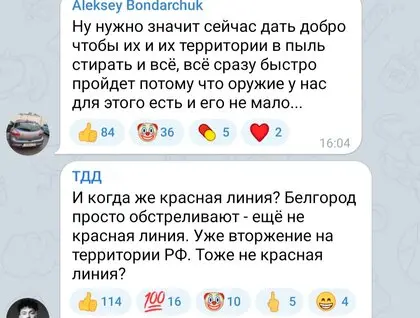 Россияне в комментариях под постами жалуются на то, как власти могли допустить прорыв границы, обстрелы и захват российских городов, "страдание мирного населения", "сравнение с землей населенных пунктов", "заминирование дорог на Белгород".