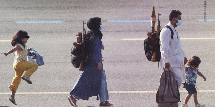 Российский государственный пропагандистский телеканал RT (прежнее название Russia Today) отредактировал фотографию семьи беженцев из Афганистана, пририсовав к ним оружие – автоматы Калашникова, гранатомет и ракетницу.