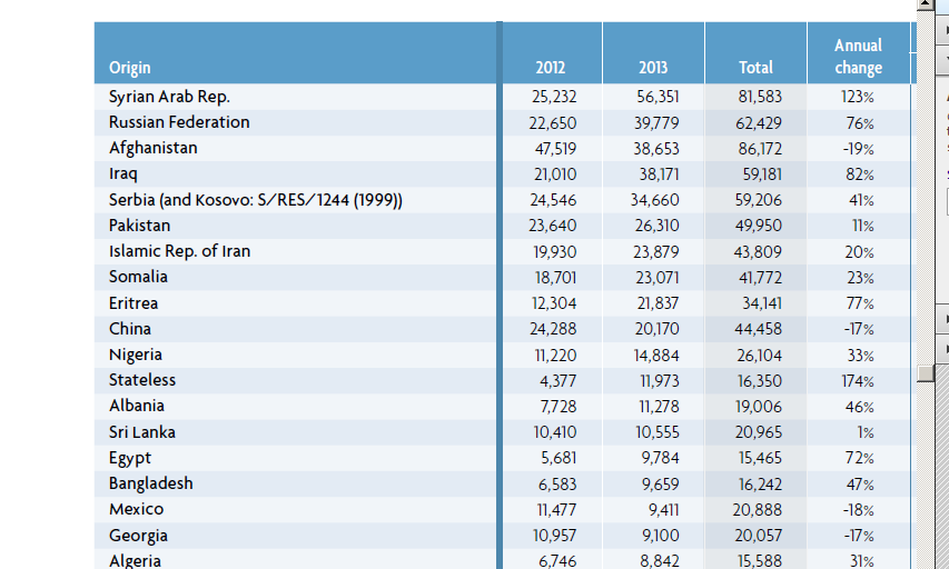 Доклад УВКБ ООН "Тенденции в сфере поиска убежища – 2013" констатирует, что в прошлом году 612 тысяч 700 человек искали убежище в Северной Америке, Европе, Восточной Азии и Тихоокеанском регионе. Это наивысший показатель, начиная с 2001 года. Отражением изменений в международной динамике является Афганистан, который в течение двух лет был основной страной поиска убежища. Сейчас он сместился на третье место, пропустив вперед Сирию и Российскую Федерацию.