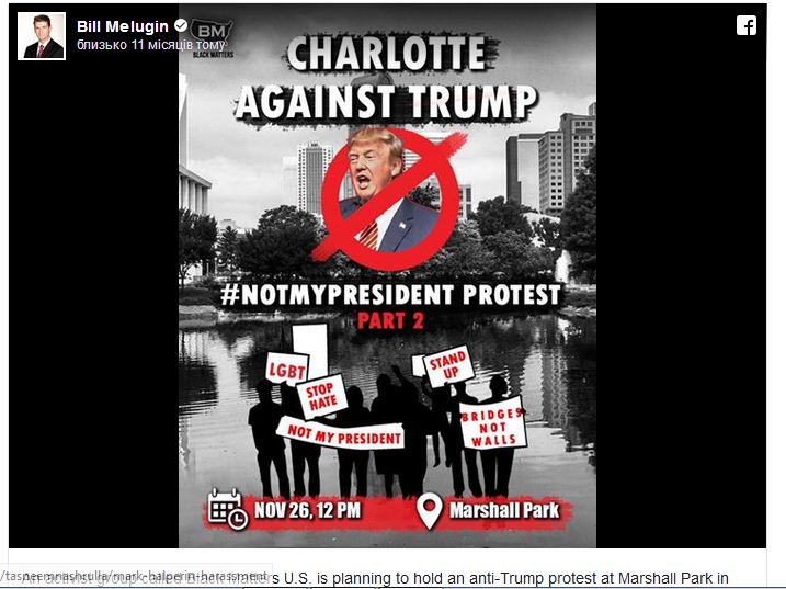 "Мы собираем акцию против Трампа в субботу", – говорилось в послании, адресованном одному из активистов, который перед этим собирал группу протеста в городе Шарлотт в штате Северная Каролина.