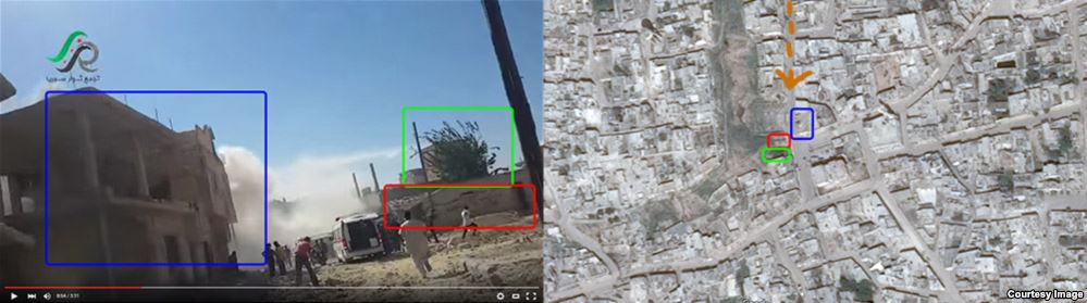 Сравнив местность на видеозаписи и спутниковые снимки Google, удалось вычислить, куда были сброшены бомбы: