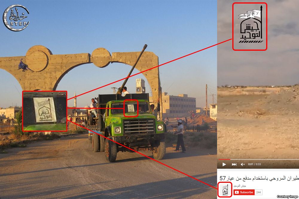 По кадрам видеозаписей авторы расследования смогли подтвердить, что Телль-Биса на момент удара находилась именно под контролем группировки "Джейш-аль-Тавхид" - об этом свидетельствует, в частности, эмблема группировки, размещенная на одном из автомобилей на видео: