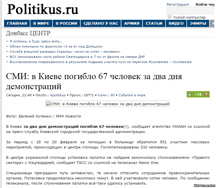 В своей "новости" российские СМИ использовали сообщение украинского информационного агентства "УНИАН" двухлетней давности. В частности, издание Lenta.ru сообщило, что "В период с 18 по 20 февраля в столкновениях в Киеве погибли 67 человек". Позже эта новость была удалена с сайта, однако сохранилась в Google cache.