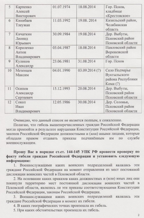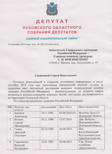 Псковский депутат Лев Шлосберг направил главному военному прокурору Сергею Фридинскому письмо со списком российских 3, которые погибли за пределами мест постоянной дислокации их подразделений.