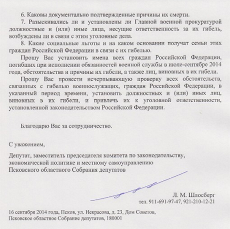 По данным Шлосберга, они погибли в период с 12 июля по 3 сентября за пределами мест постоянной дислокации их воинских подразделений. Депутат просит установить имена и обстоятельства гибели всех российских военных за последние месяцы, а также выяснить, кто несёт ответственность за их смерть.