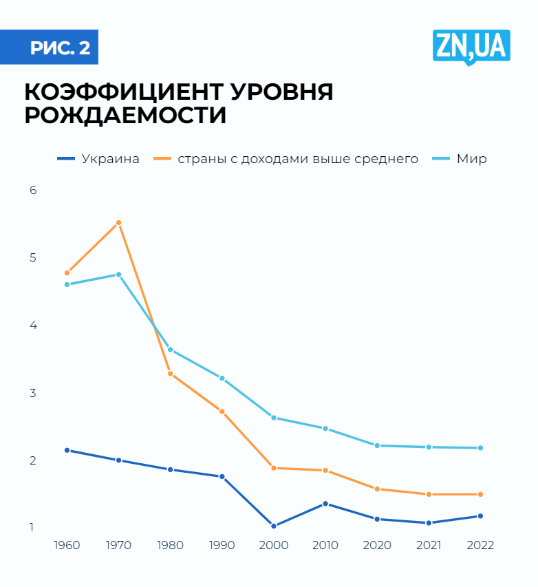 Способность Украины реагировать на эти вызовы, учитывая текущие обстоятельства, даже оценивать не стоит. Достаточно взглянуть на уровень нашей рождаемости по сравнению со средним уровнем стран нашей группы и мира в целом. У них хотя бы еще есть достаточное количество 55-летних, родившихся в последний пик в 1970-х, у нас даже этого нет (см. рис. 2). Наш коэффициент рождаемости один из самых низких в мире — 1,26, и этому падению предшествовала демографическая яма начала нулевых, когда уровень рождаемости был вообще 1,21, а до этого плавное сползание с 2,24 в 60-х прошлого века до 1,85 — в 1990-х.