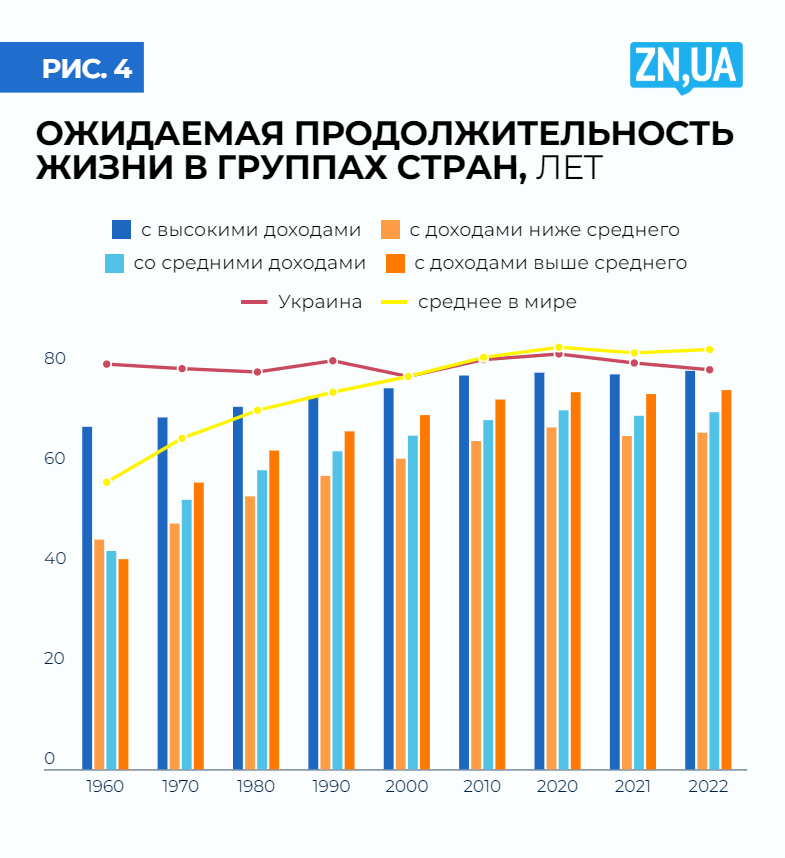 Украина должна была бы быть в этом ряду, потому что по уровню рождаемости у нее аналогично низкие показатели, но более низкая ожидаемая продолжительность жизни не пускает (см. рис. 4). Нет, это не хорошие новости, ведь базовый план выживания, предлагаемый экспертами WEF, — более широкое привлечение людей старшего возраста к рынкам труда ради увеличения количества дефицитных рабочих рук. К сожалению, нам и он не подойдет. Несмотря на общий тренд на рост, в Украине ожидаемая продолжительность жизни топчется в диапазоне 68–70 лет с конца 1960-х. В среднем украинец живет на пять лет меньше, чем поляк, и на десять лет меньше, чем немец. Причин море, от образа жизни до качества медицинских услуг и профилактики болезней. Но очевидно, что полномасштабная война точно не улучшит этот показатель.