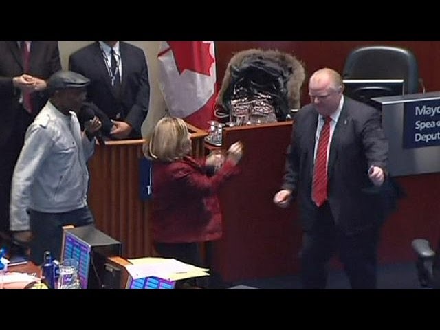 Мэр пустился в пляс прямо на заседании городского совета, когда приглашенные музыканты пели рождественскую песню. Женщина в красном, партнерша Форда, – спикер городского совета.