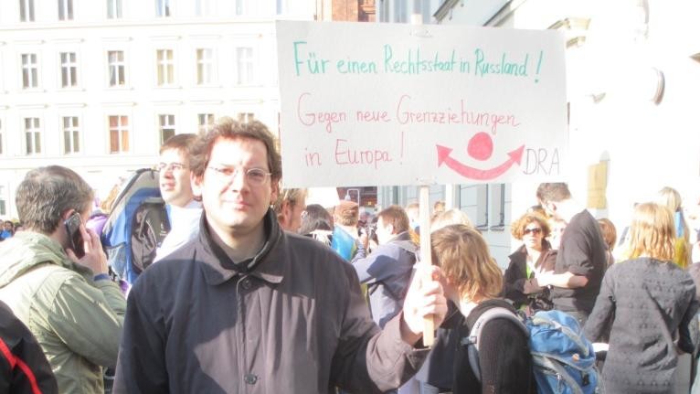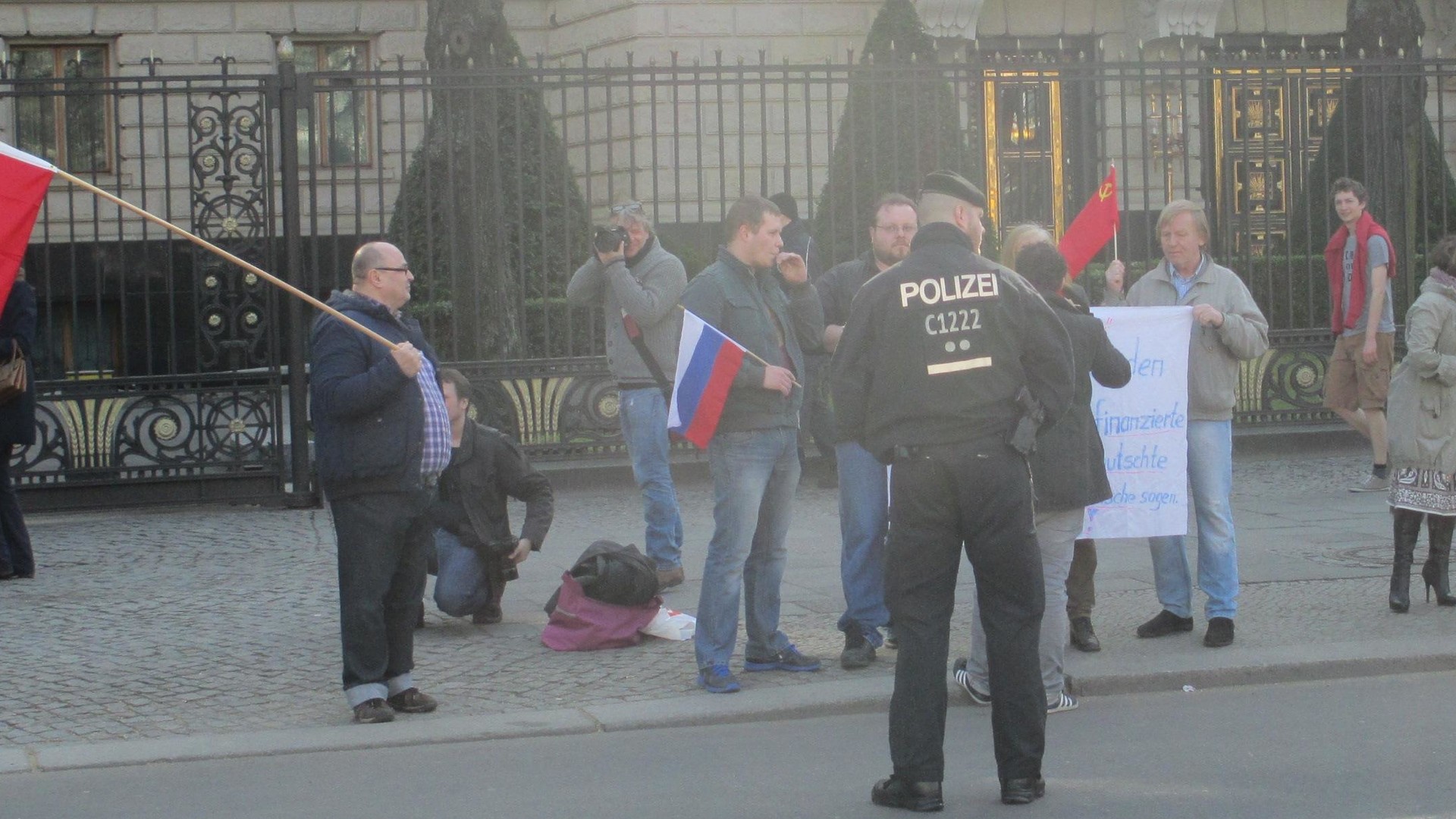 В свою очередь, у российского посольства собрались несколько несогласных - немецких леворадикальных маргиналов.