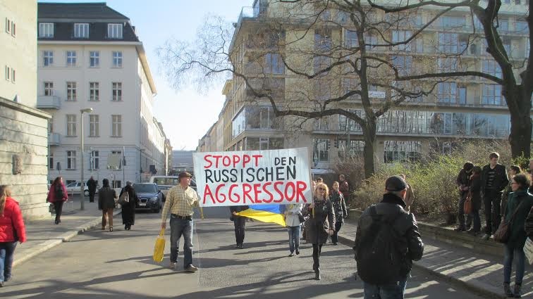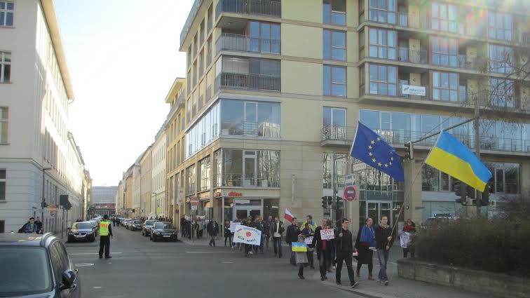 Активист стражи Майдана прочитал открытое письмо к редакции "Шпигеля", расположенной рядом. Журналисты этого издания публиковали статьи о событиях в Киеве и Крымском кризисе, в которой утверждалось, что украинской еврореволюцией заправляют махровые националисты, натравливающие татар на русских. После этого начался марш.