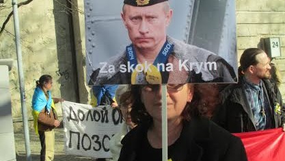 Вопреки тому, что сход замышлялся как акция солидарности с Украиной, плакаты носили не приободряющий или воодушевляющий характер (условно - "Украина, мы с тобой!"), а по смыслу скорее были направлены против Путина и оккупации Крыма. !zn