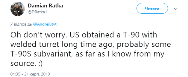 Ратка ссылается на некий "собственный источник", который утверждал, что видел именно Т-90, причем со сварной башней, что является верным отличительным признаком поздней модели этого танка. Сам Ратка считает, что американцы могли получить этот танк от Индии, или же что эта машина может быть одним из экспортных вариантов Т-90 из другого государства.