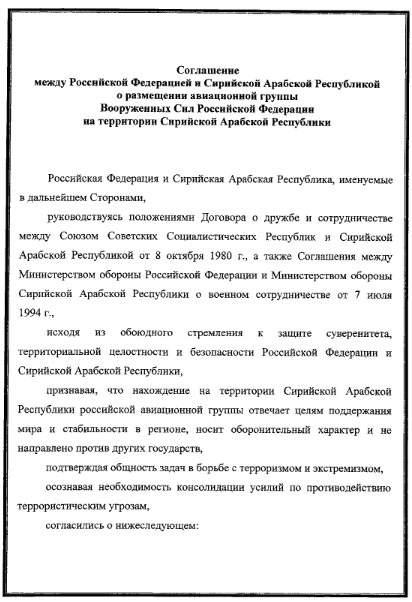 Российская Федерация и Сирийская Арабская Республика заключили соглашение о размещении российской авиагруппы в Сирии на бессрочный период. Соответствующий документ опубликован 14 января на сайте правовой информации РФ.