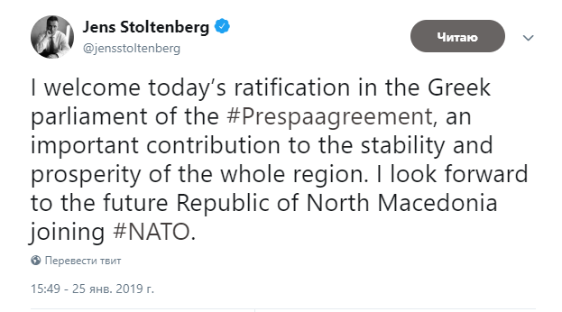 Генеральный секретарь НАТО Йенс Столтенберг после ратификации в греческом парламенте исторического договора об изменении названия Македонии на Республика Северная Македония ждет присоединения страны в Альянс. Об этом он сообщил в своем Twitter.