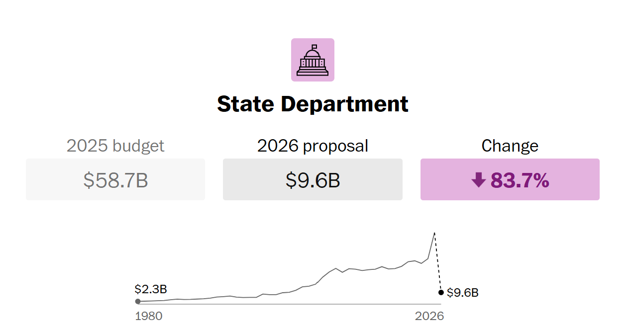 Президент США Дональд Трамп предлагает в следующем году сократить почти 84% финансирования Государственного департамента, который является центром американской дипломатии и внешней политики, пишет The Washington Post. Именно такое предложение Трамп изложил в бюджетном запросе на 2026 год.