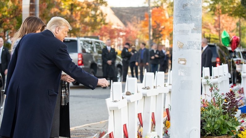 Возле синагоги президента встретили раввин Джеффри Майерс и посол Израиля в США Рон Дермер, который также прибыл в Питтсбург. Все они по традиционному иудейскому обычаю почтили память погибших и зажгли свечи у входа в здание, которое остается оцепленным как место преступления. Трамп провел у синагоги около трех часов, а затем полтора часа общался с медиками и раненными в местной больнице.