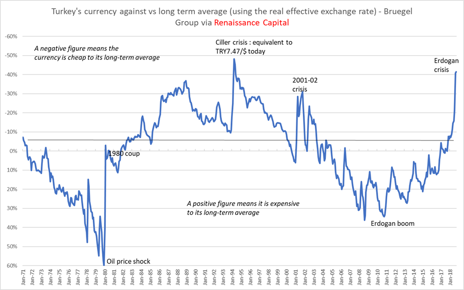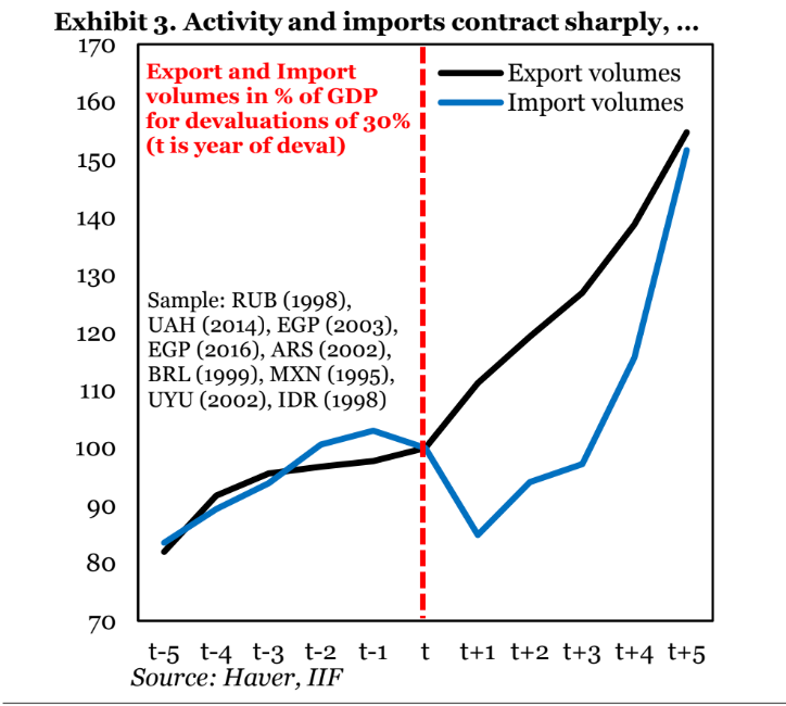 Когда валюты обесцениваются столь же резко, как и лира, происходят две вещи: реальный ВВП резко падает, а дефицит текущего счета переходит в избыток. Робин Брукс, Сержи Ланау и Уграс Улка из Института международных финансов обнаружили, что это произошло в девяти случаях с 1980 года, когда реальный обменный курс снизился на 30% и более: Мексика в 1995 году, Индонезия и Россия в 1998 году, Бразилия в 1999 году, Аргентина и Уругвай в 2002 году, Египет в 2003 и 2016 годах и Украина в 2014 году.