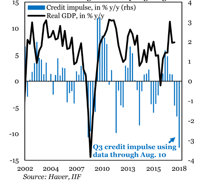 Ошеломление в турецкой лире и последующий откат кредитного бума в прошлом году оказали аналогичное влияние на снижение внутренней экономической активности. Как показывают данные IIF, кредитный импульс Турции, который является изменением потока кредитов, стал негативным и теперь находится вблизи уровней, которые последний раз видели во время глобального финансового кризиса десять лет назад – в 2008 году.