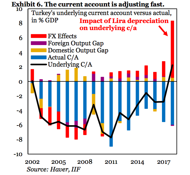 Кредитный кризис такого масштаба, без сомнения, повлияет на рост ВВП в будущем и уже помог улучшить внешний баланс Турции. По оценкам IIF, текущий баланс страны теперь положителен.