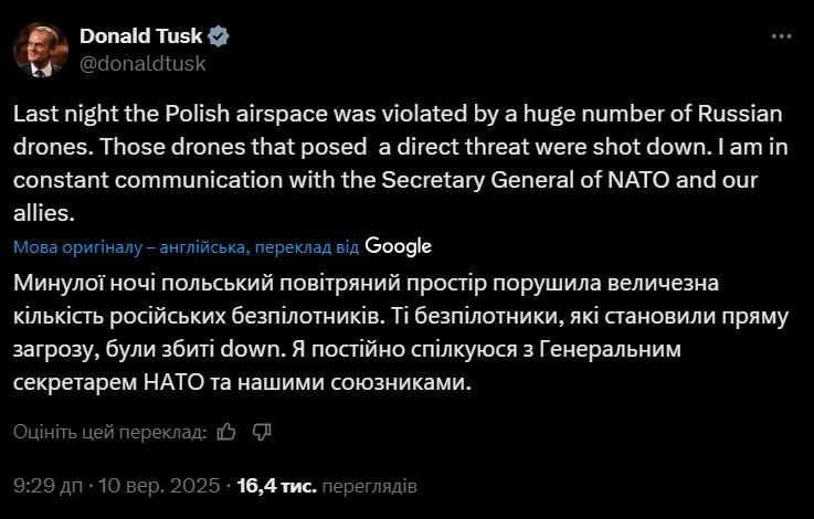 Премьер-министр Польши Дональд Туск прямо заявил, что воздушное пространство его страны нарушили российские дроны. По его словам, дроны, которые представляли опасность, уже сбили.