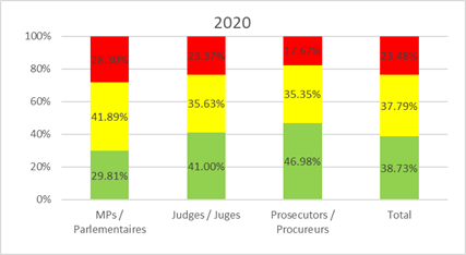 К концу 2020 года государства-члены ГРЕКО полностью выполнили почти 40% своих рекомендаций по предотвращению коррупции в отношении депутатов, судей и прокуроров. Рекомендации с наименьшим соблюдением были выданы в отношении депутатов (только 30% полностью выполнены), а затем судьи (41%) и прокуроров (47%).
