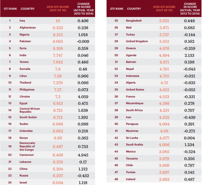 В первую десятку рейтинга вошли Ирак, Афганистан, Нигерия, Пакистан, Сирия, Индия, Йемен, Сомали, Ливия и Таиланд, перед Украиной, на 11 позиции - Филиппины. Последнее место у Замбии, а у России – 23 строчка.
