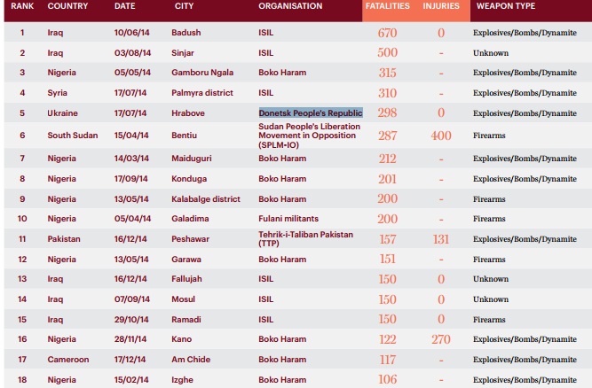 В результатах исследования утверждается, что уровень террористической угрозы в 2014 году в мире повысился, это касается и Украины, где в прошлом году в Донбассе погибли 665 человек (сообщалось, что за время конфликта в Донбассе погибли 6 тысяч 400 человек, по данным ООН). Крушение малайзийского "Боинга" над Донбассом вошло в пятерку самых ужасных катастроф.