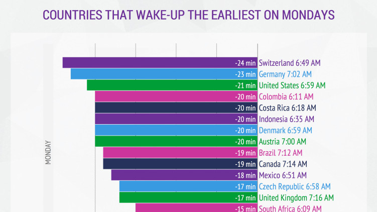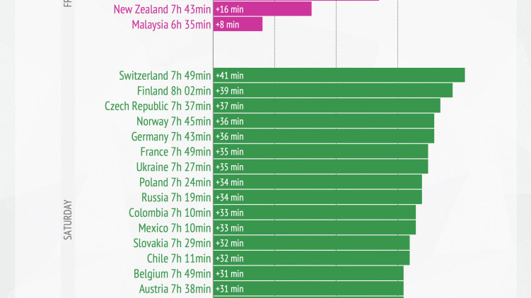 Тем не менее большинство людей в мире (71 %) просыпается в лучшем настроении по субботам. Кроме того у почти 90 % более длинный сон в ночь на субботу. В то же время, две трети респондентов заявили, что они тратят наименьшее количество времени в постели по воскресеньям.