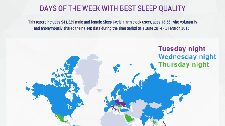 Также данные свидетельствуют о том, что лучшее качество сна во всем мире происходит в среду. Более половины (58 %) опрошенных представителей стран заявили, что у них был самый спокойный сон в эту ночь, у китайцев он еще и наиболее качественный.