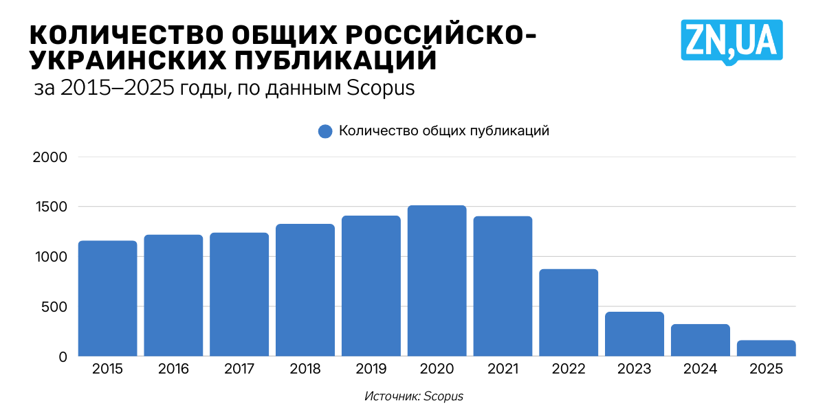 Поэтому логично предположить, что после 2022 года в научном поле Украина с Россией не сотрудничает. Впрочем, факты перечеркивают эти на первый взгляд логичные предположения. По состоянию на середину 2025 года в редакционных советах российских журналов значилось около 90 украинских ученых, а количество общих публикаций (в перечне авторов были одновременно украинцы и россияне) с начала полномасштабного вторжения превысило 1800 (!) (по данным базы Scopus по состоянию на 14 августа 2025 года).
