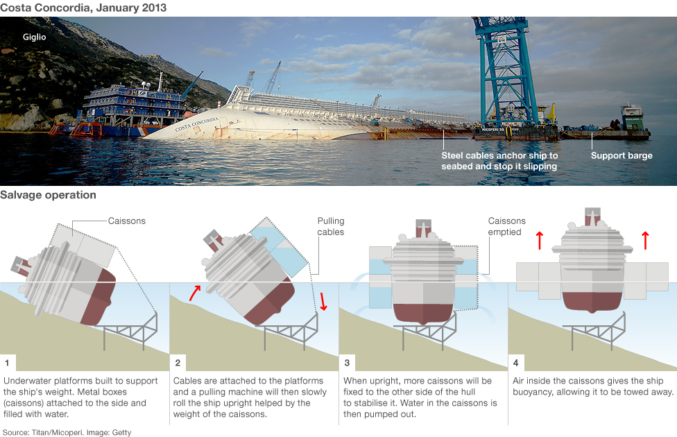 Местные жители уже привыкли к виду лежащего на боку лайнера на рифах у побережья. Рядом была построена большая платформа, на которой трудятся и живут 400 специалистов, готовящих судно к эвакуации. Темпы работ отстают от графика, а это означает, что и грядущий курортный сезон островитяне проведут с лайнером, "украшающим" вид на подходе к порту.