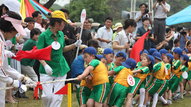Одетые в яркие национальные костюмы дети вместе с воспитателями поблагодарили лидера КНДР Ким Чен Ына за заботу о них и исполнили популярную песню "Мы никому не завидуем". После этого под аплодисменты публики маленькие жители КНДР продемонстрировали свое спортивное мастерство и получили призы.