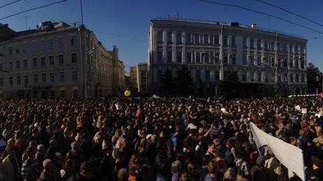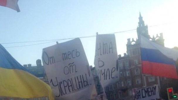 Очевидцы рассказывают, что силовики проверяли все плакаты и забирали те, где была фамилия Путина. Участники акции скандировали "Нет войне" и "Нельзя стрелять в братьев". Люди говорят, что они против агрессивной политики их президента Владимира Путина.