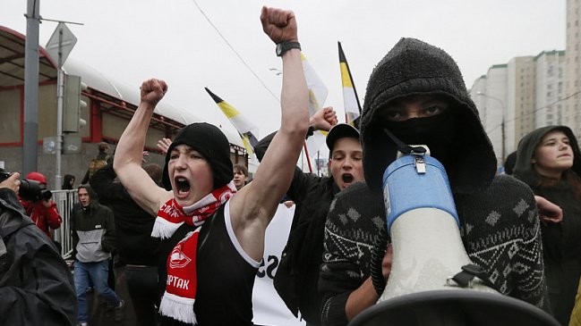 Некоторые из собравшихся были одеты в черные маски-"балаклавы", а также в черные куртки и брюки. Молодые люди развернули транспаранты с лозунгами: "Русские, объединяйтесь!". Другие несли флаги футбольных фанатских организаций, в том числе с символикой клуба "Спартак".