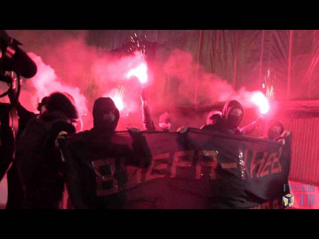 Кроме того, участники акции развернули флаг Украины. В ходе шествия молодые люди жгли фаеры.
