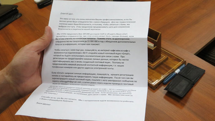 "Мы готовы предложить Вам 100 000 долларов и обсудить Ваши опыт, экспертизу и сотрудничество. При этом оплата может быть гораздо больше, если Вы готовы ответить на конкретные вопросы. Помимо этого за долгосрочное сотрудничество мы предлагаем до $ 1 000 000 в год с обещанием дополнительных бонусов за информацию, которая нам поможет", - говорится в письме.