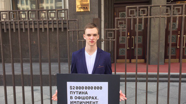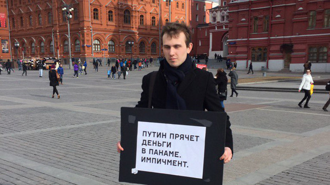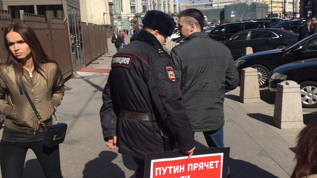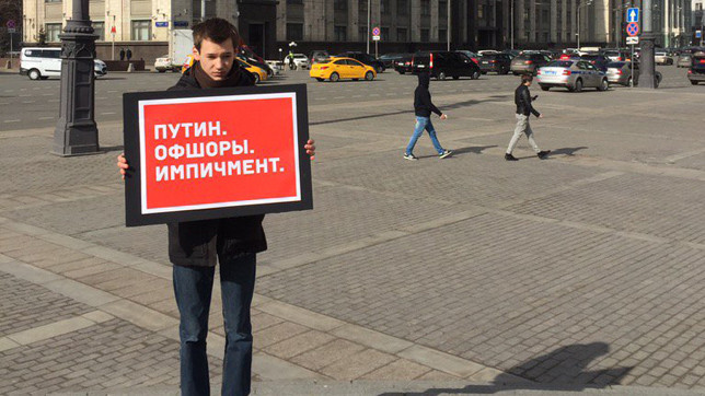 В Москве возле Кремля 5 апреля несколько человек выступили с одиночными пикетами. Участники требовали импичмента президента России Владимира Путина из-за публикации информации о его оффшорных активах. "Путин. Офшоры. Импичмент", - написано на плакатах.