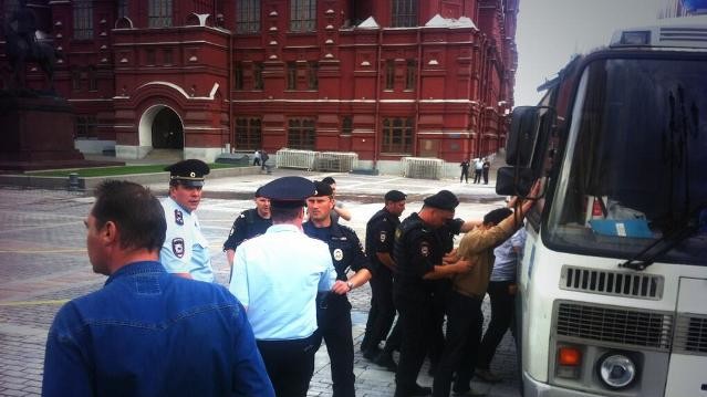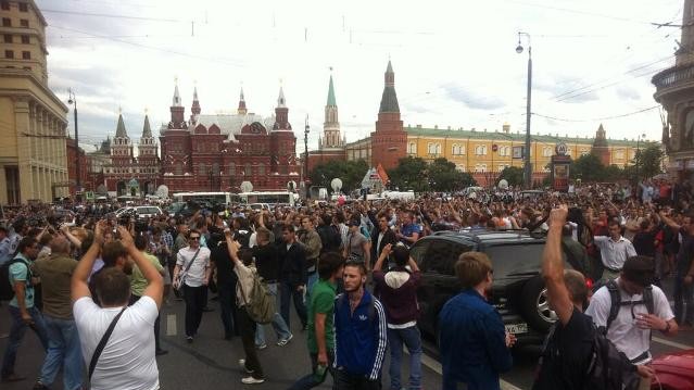 Сообщается, что демонстранты вышли на проезжую часть на Охотном Ряду и перекрыли две или три полосы движения. Начались задержания на проезжей части. Людей заносили в полицейские автобусы под крики митингующих "Позор!".