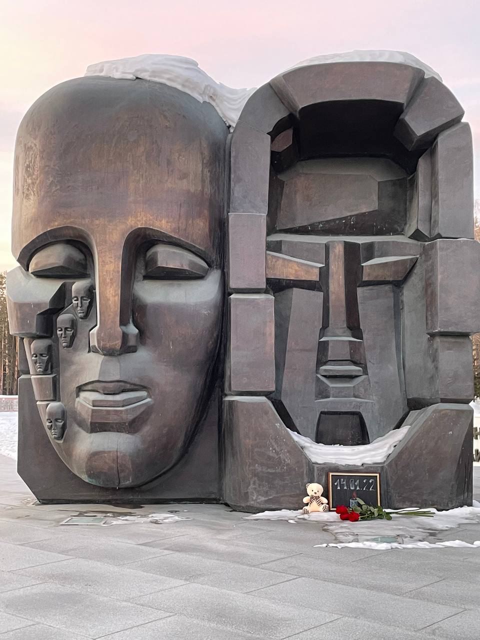 Люди возложили цветы и игрушки на память о погибших от вражеской атаки украинцев и у монумента, посвященного жертвам политических репрессий, в Екатеринбурге. Там установили надпись "14.01.2023" в рамке.