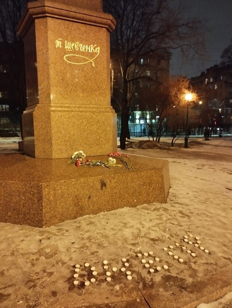 Так, в Санкт-Петербурге появилось слово "Днепр", выложенное свечами, у памятника Тарасу Шевченко и цветы на его подножии. Кроме этого, по данным местного издания "Бумага", люди стали приносить цветы на Смоленское кладбище, где первоначально был похоронен украинский поэт.
