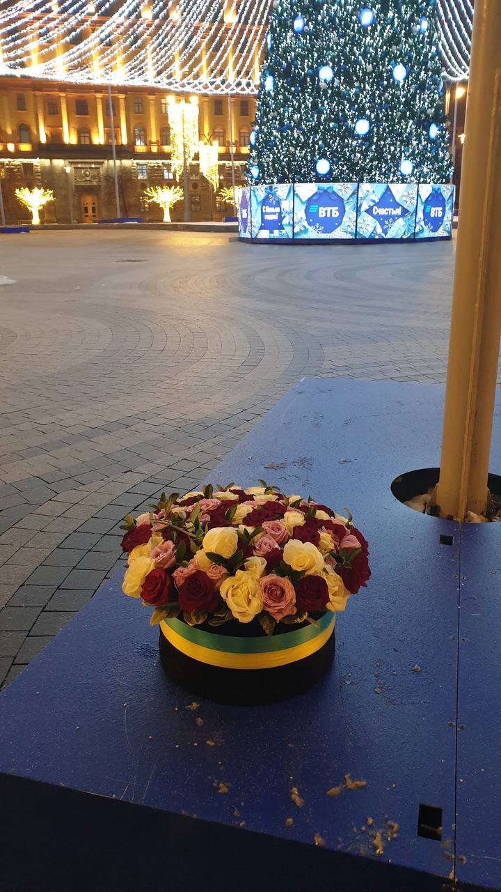 Кроме того, неизвестные оставили букет цветов с сине-желтой лентой напротив здания ФСБ на Лубянской площади Москвы.