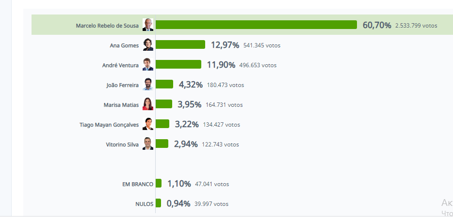 По состоянию на 5:30 по киевскому времени, подсчитали уже сто процентов голосов — 99,9%. Де Соуза набрал на этом этапе 60,7%. На втором месте кандидат от Социалистической партии Ана Гомеш (12,9%), на третьем — лидер крайне правой партии «Хватит!» (Chega) Андре Вентура. Остальные кандидаты набрали менее 5% голосов.