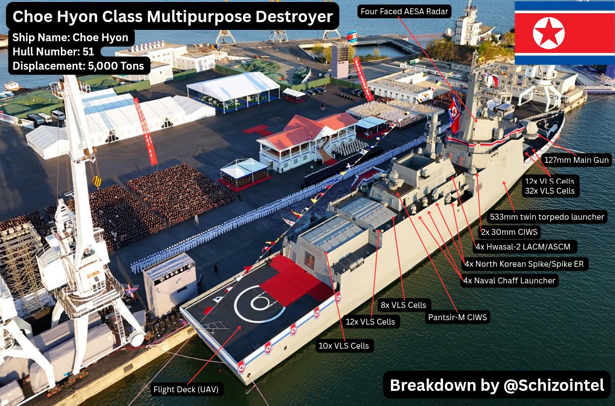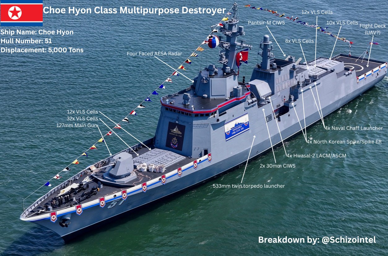 В субботу госСМИ КНДР проинформировали, что 5000-тонный военный корабль был оснащен «самым мощным вооружением». Как сообщил секретарь правящей партии Чжо Чун Рена, эсминец был построен «в течение 400 с лишним дней в совершенстве нашими собственными силами и технологиями».