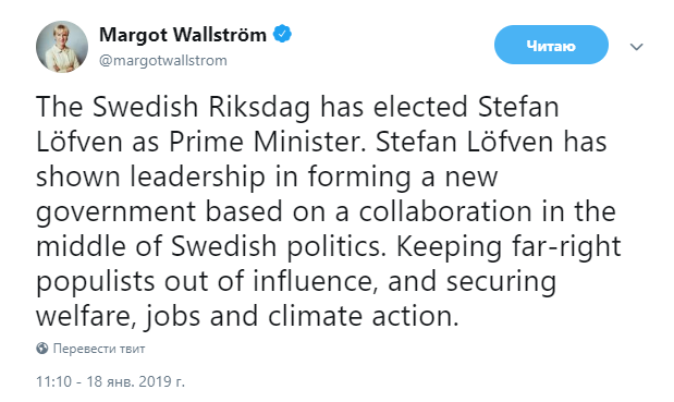 "Шведский Риксдаг избрал Стефана Лёвена премьер-министром. Он проявил лидерство в формировании нового правительства. Создание Кабинета основано на сотрудничестве центристских партий, предотвращая влияние крайне правых популистов", - говорится в сообщении.